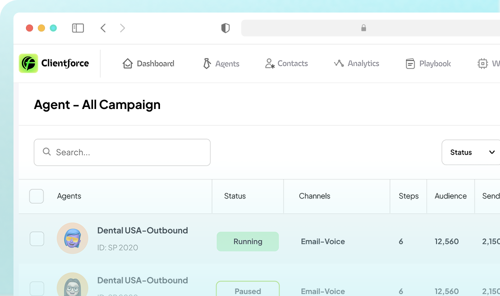 Set A Goal, Spin Up An AI Sales Agent, Feed It Your Offer, And Hit Go. ClientForceAI