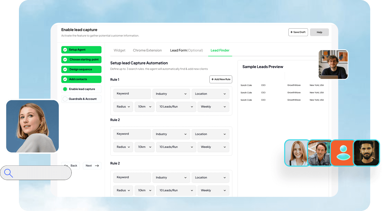 Import CSV, Enable The Finder For Auto-Prospecting, Add Widgets To Your Site, Or Capture From LinkedIn/Google Business Via The Chrome Extension.