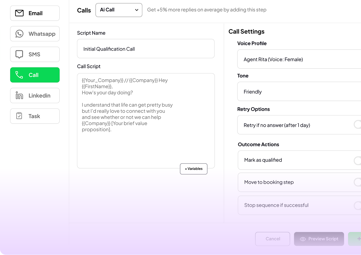 Your Agent Runs A Goal-Aligned Sequence — Email → WhatsApp → Voice — Sends Dynamic Proposals, And Books Calls 24/7 With Compliance Guardrails.